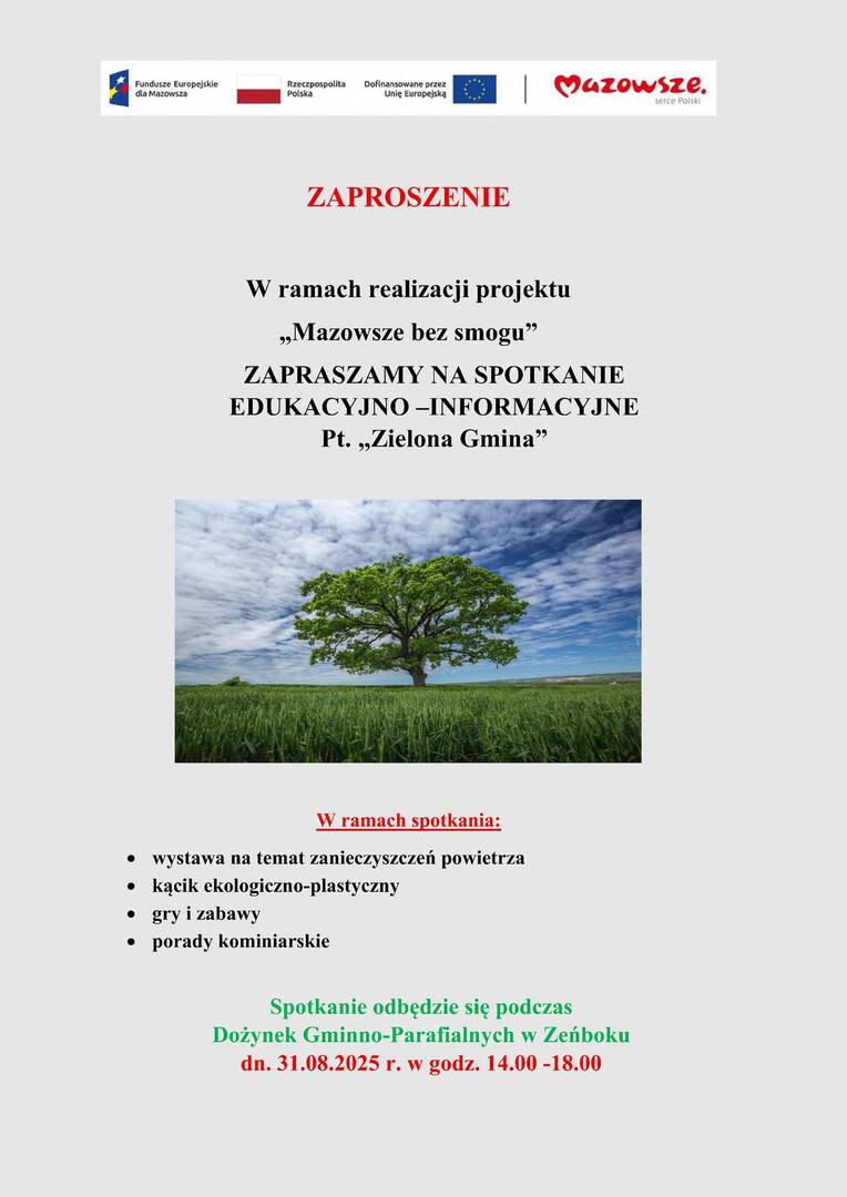 Spotkanie pn. "Zielona Gmina" odbyło się w dniu 31.08.2025 r. podczas Dożynek Gminno-Parafialnych w Zeńboku. Było to już drugie spotkanie z cyklu zaplanowanych na ten rok wydarzeń edukacyjno-informacyjnych dofinansowanych ze środków w ramach projektu pn.” Mazowsze bez smogu” współfinansowanego z Europejskiego Funduszu Rozwoju Regionalnego w ramach Priorytetu: II: „Fundusze Europejskie na zielony rozwój Mazowsza” Działania: 2.1: „Efektywność energetyczna” programu Fundusze Europejskie dla Mazowsza 2021-2027. Akcja była skierowa dla ogółu społeczeństwa.