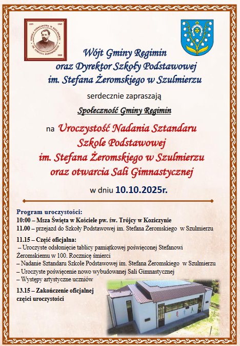 W piątek, 10 października 2025 roku, społeczność Szulmierza i Gminy Regimin zgromadziła się na wyjątkowych uroczystościach poświęconych pamięci Stefana Żeromskiego – patrona Szkoły Podstawowej w Szulmierzu. Obchody rozpoczęła uroczysta Msza Święta w Kościele pw. św. Trójcy w Koziczynie, podczas której poświęcono nowy sztandar szkoły.