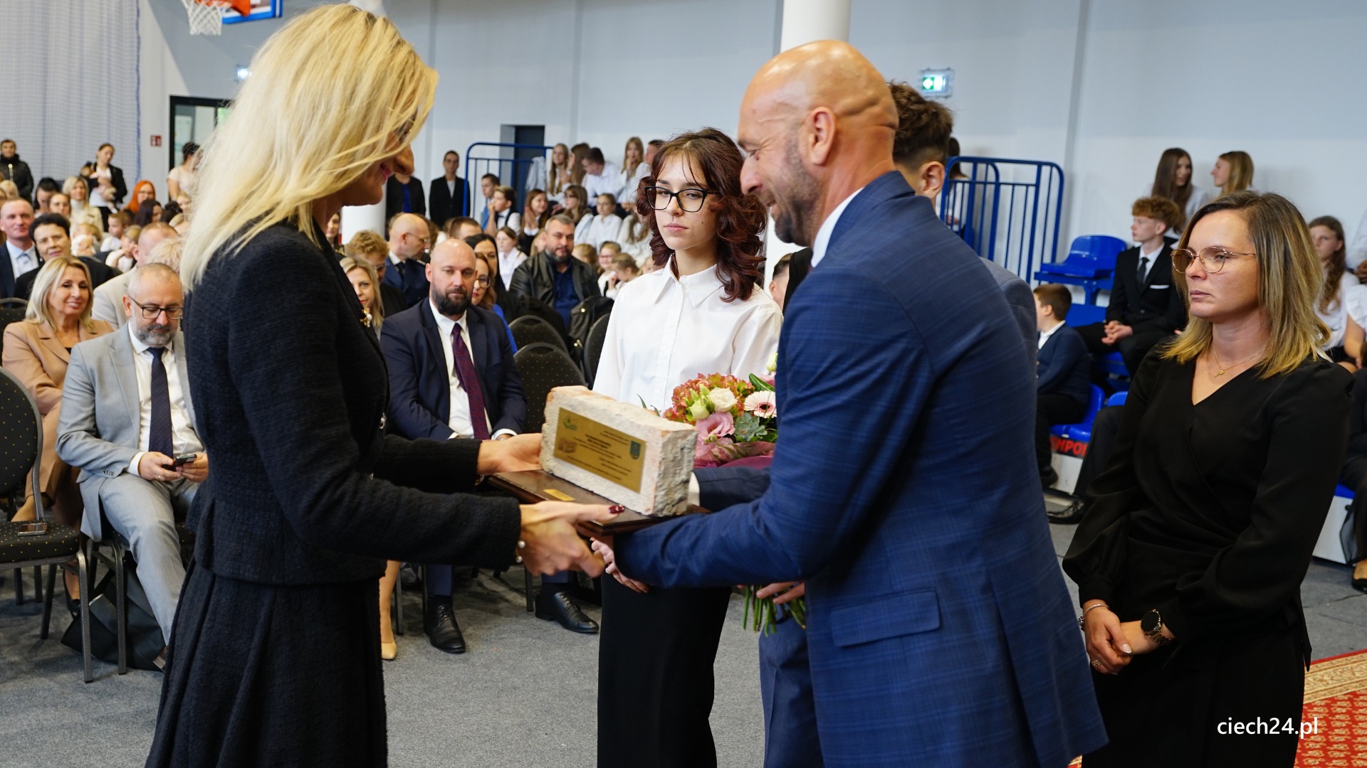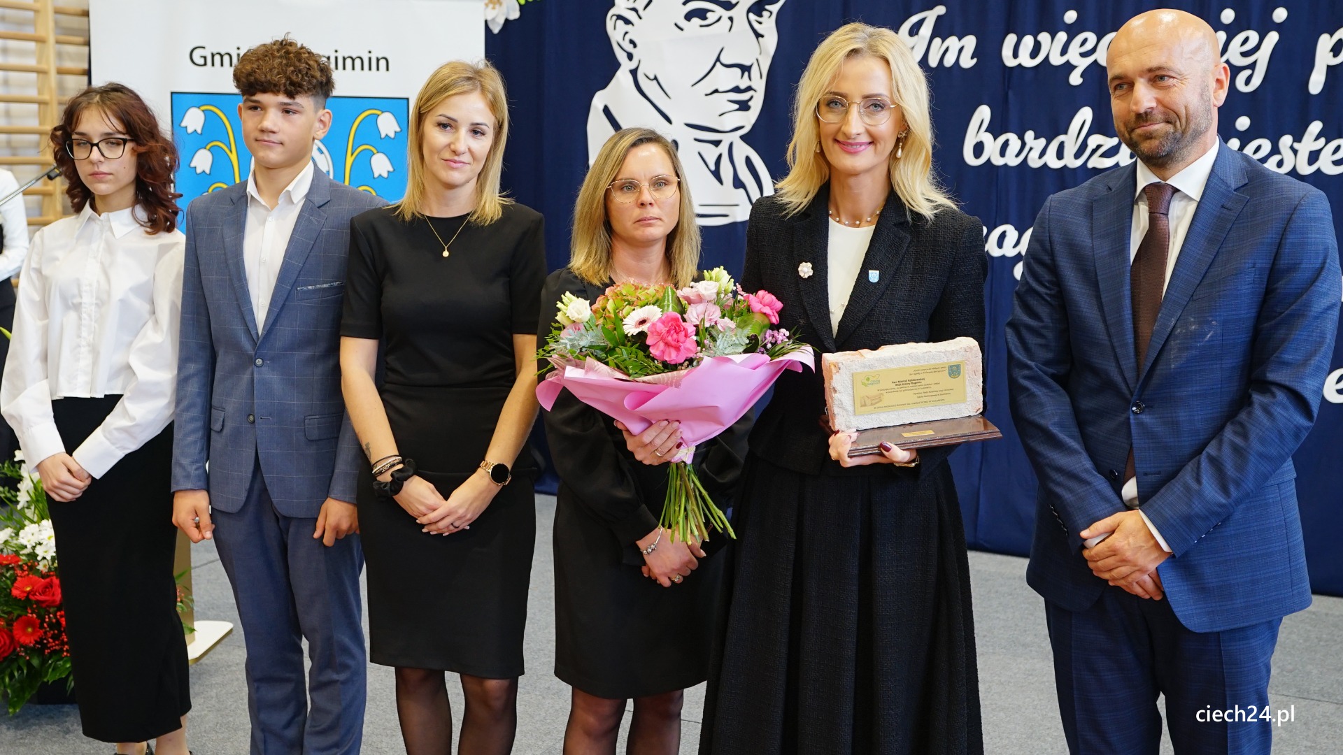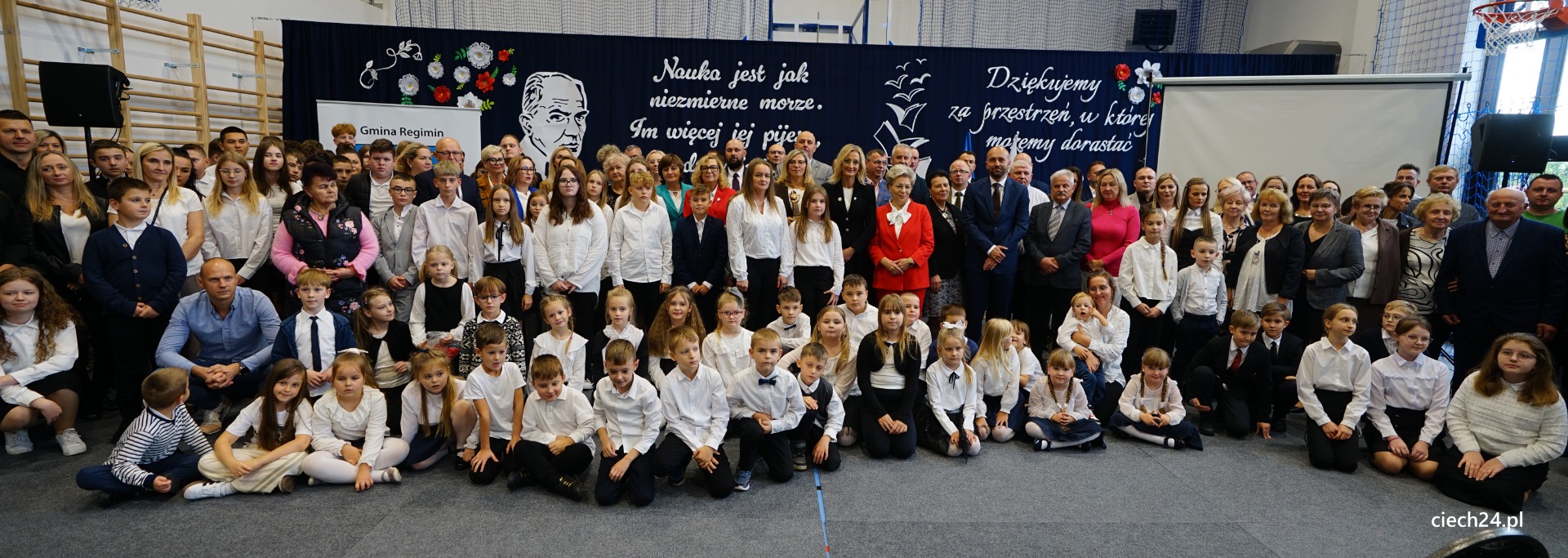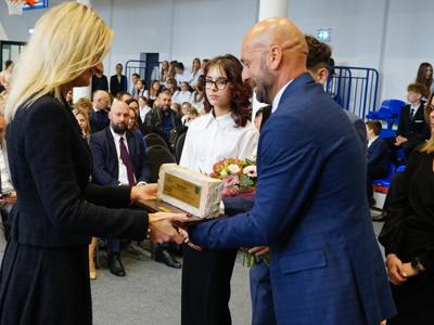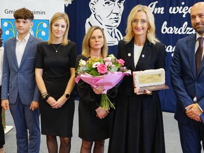 Podczas uroczystości nie zabrakło wyróżnień i podziękowań dla osób wspierających szkołę. Szczególne słowa uznania Pan Paweł Mazurkiewicz – Dyrektor Szkoły Podstawowej wraz z Rodzicami i Uczniami skierowali do Pani Marioli Kołakowskiej – Wójt Gminy Regimin, gdzie podziękowali za nieustanne wsparcie działań szkoły i ogromne zaangażowanie w budowę nowej Sali Gimnastycznej.