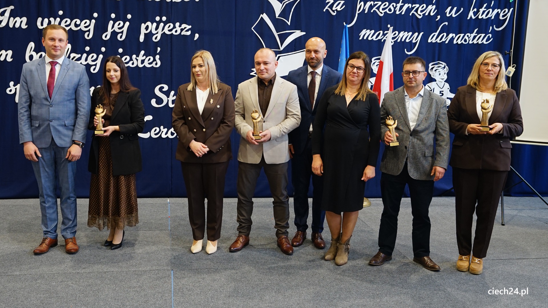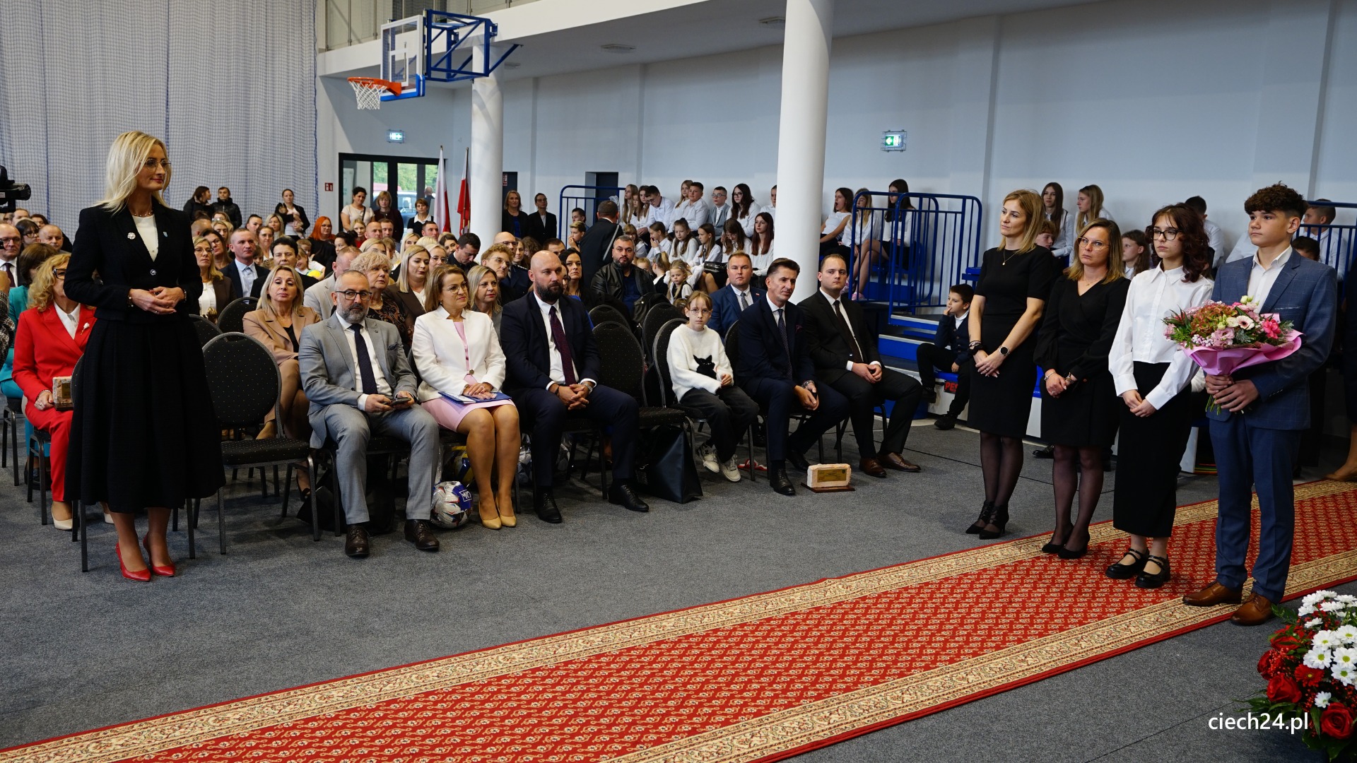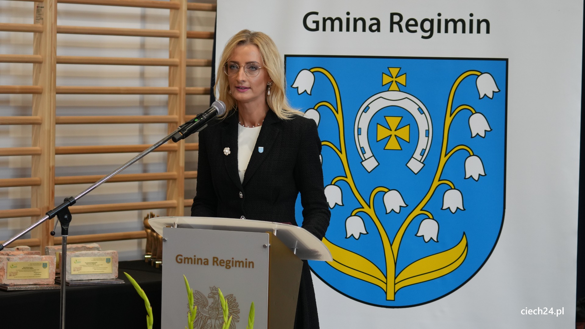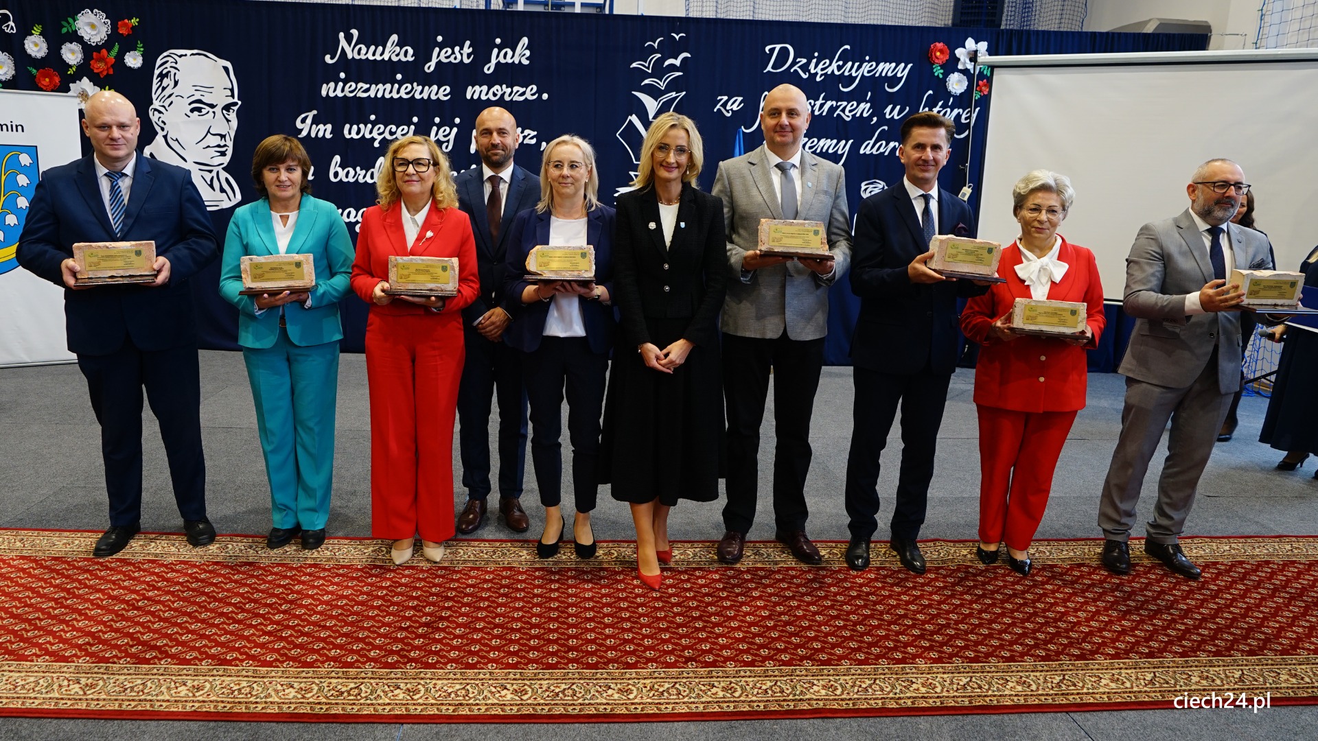 Podczas uroczystości nie zabrakło wyróżnień i podziękowań dla osób wspierających szkołę. Szczególne słowa uznania Pan Paweł Mazurkiewicz – Dyrektor Szkoły Podstawowej wraz z Rodzicami i Uczniami skierowali do Pani Marioli Kołakowskiej – Wójt Gminy Regimin, gdzie podziękowali za nieustanne wsparcie działań szkoły i ogromne zaangażowanie w budowę nowej Sali Gimnastycznej.