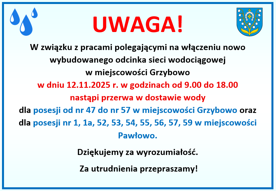 Przypominamy o przerwie w dostawie wody w dniu dzisiejszym w miejscowości Grzybowo i Pawłowo.