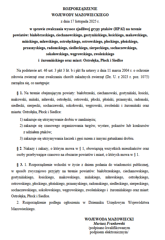 W związku z Rozporządzeniem Wojewody Mazowieckiego z dnia 17 listopada 2025 roku na terenie obejmującym m. in. powiat ciechanowski, czyli również Gminę Regimin obowiązuje: