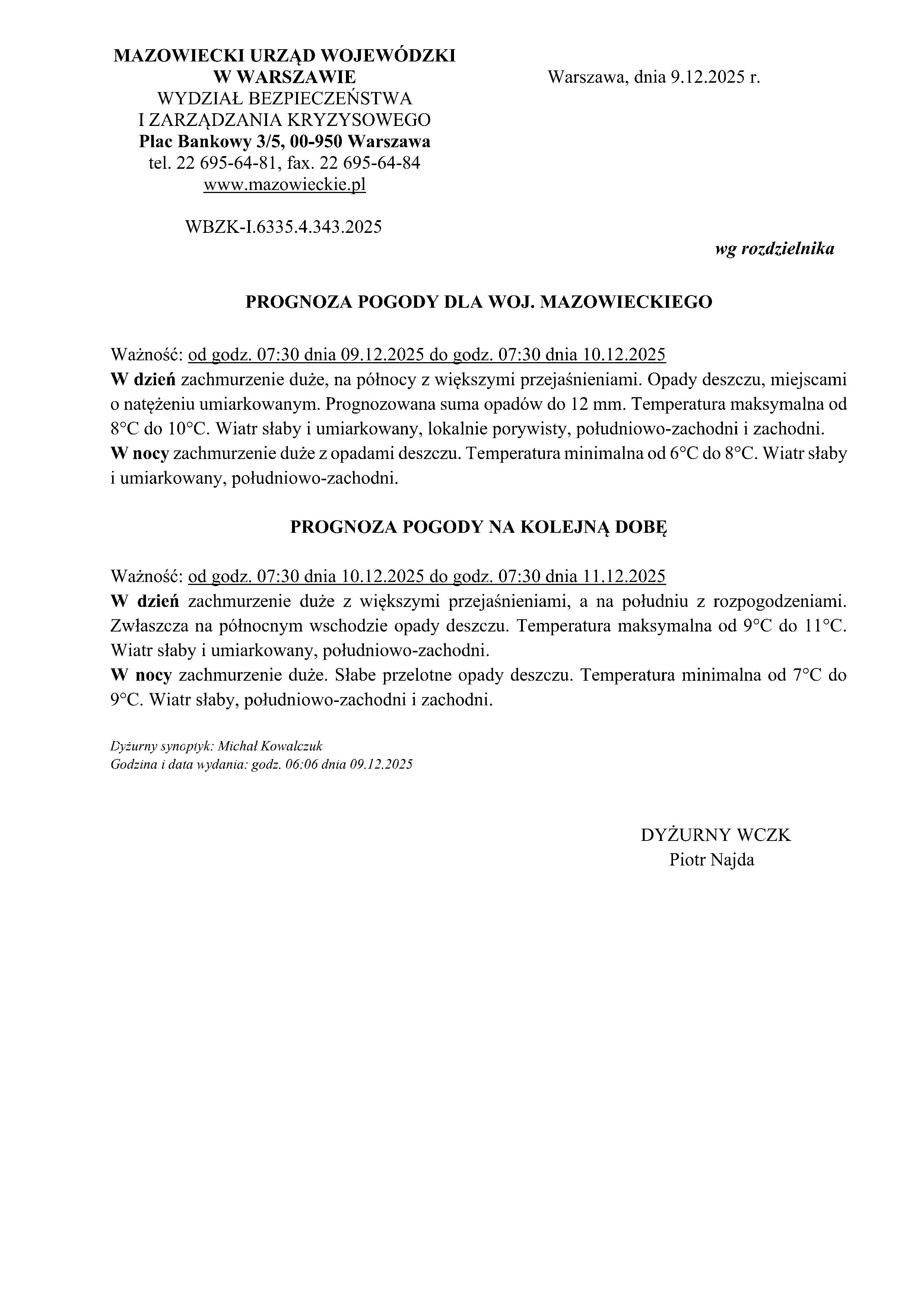 Prognoza pogody dla Mazowsza 09.12.2025 r.