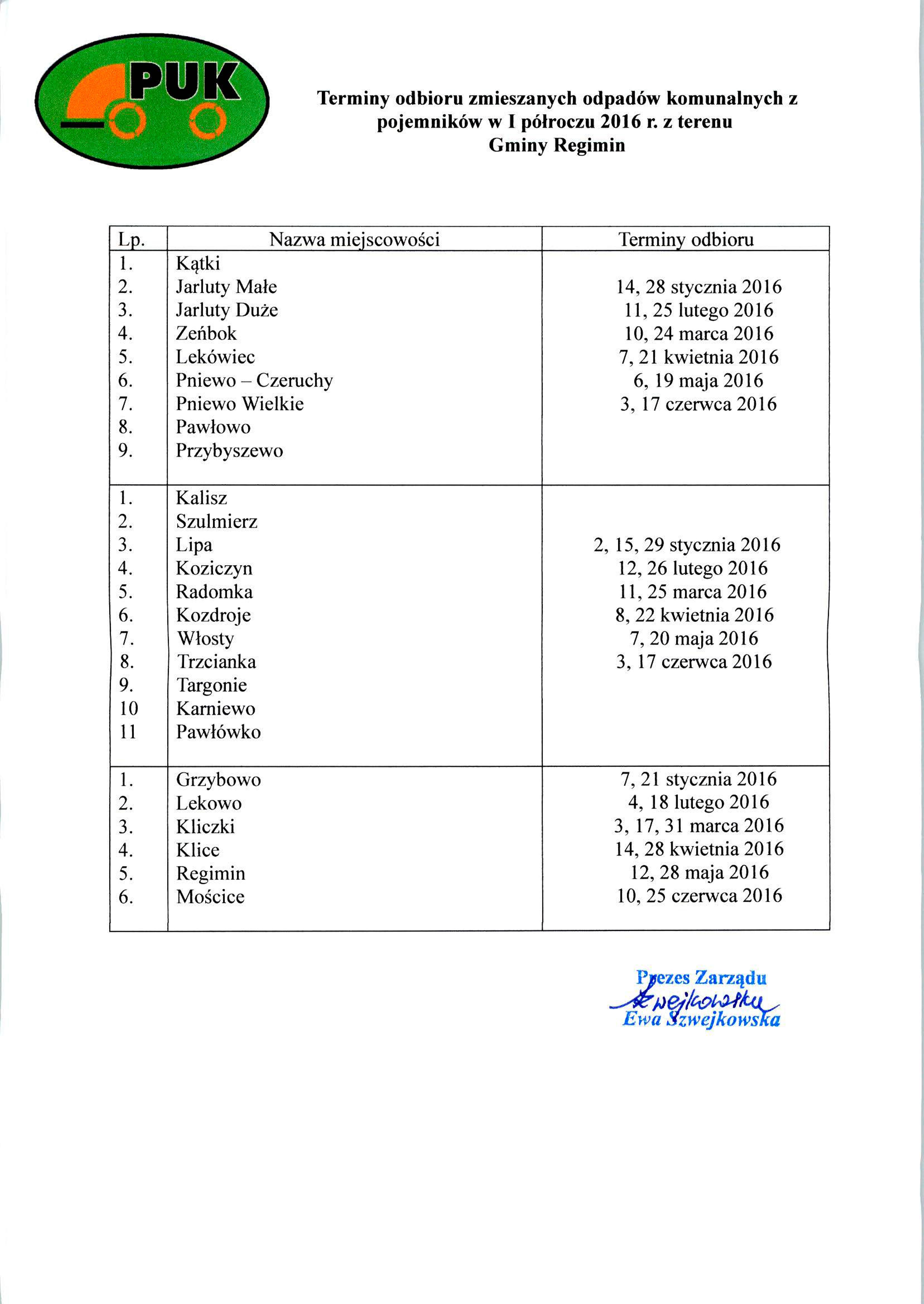 HARMONOGRAM odbioru odpadów komunalnych na I półrocze 2016r. w gminie Regimin.