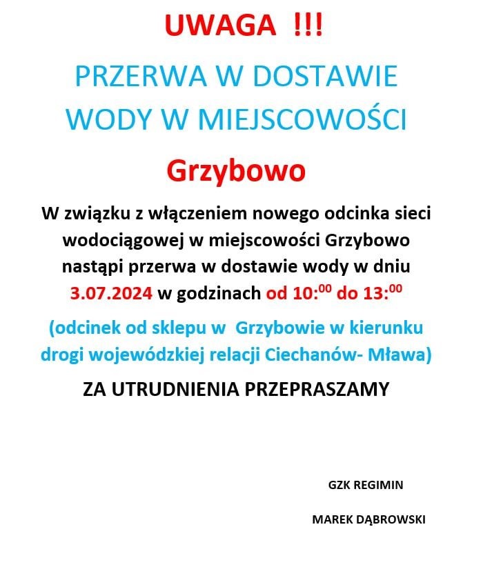 W związku z I etapem rozbudowy sieci światłowodowej na terenie Gminy Regimin przez,