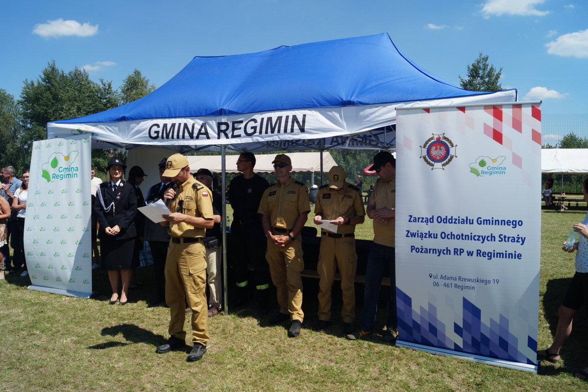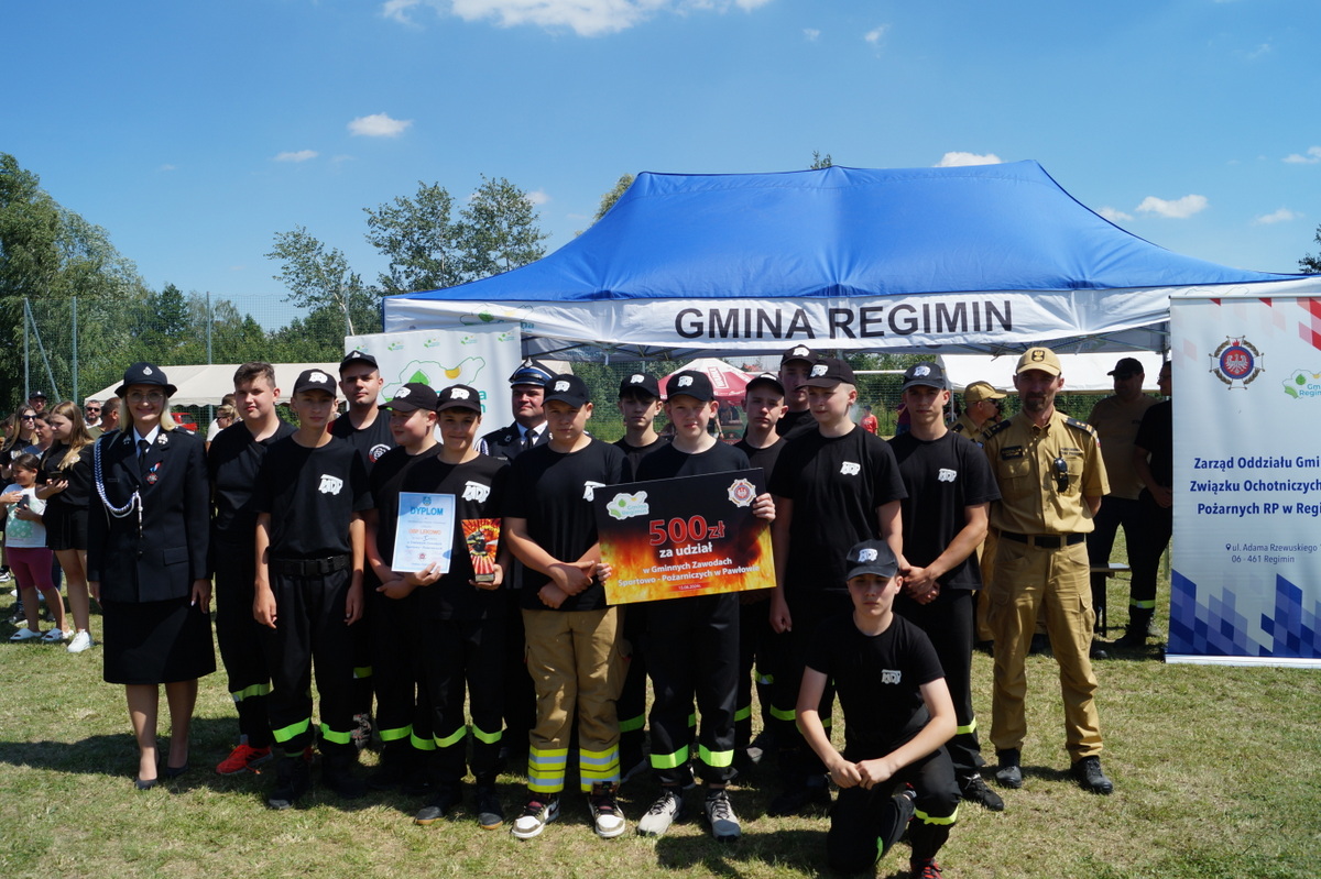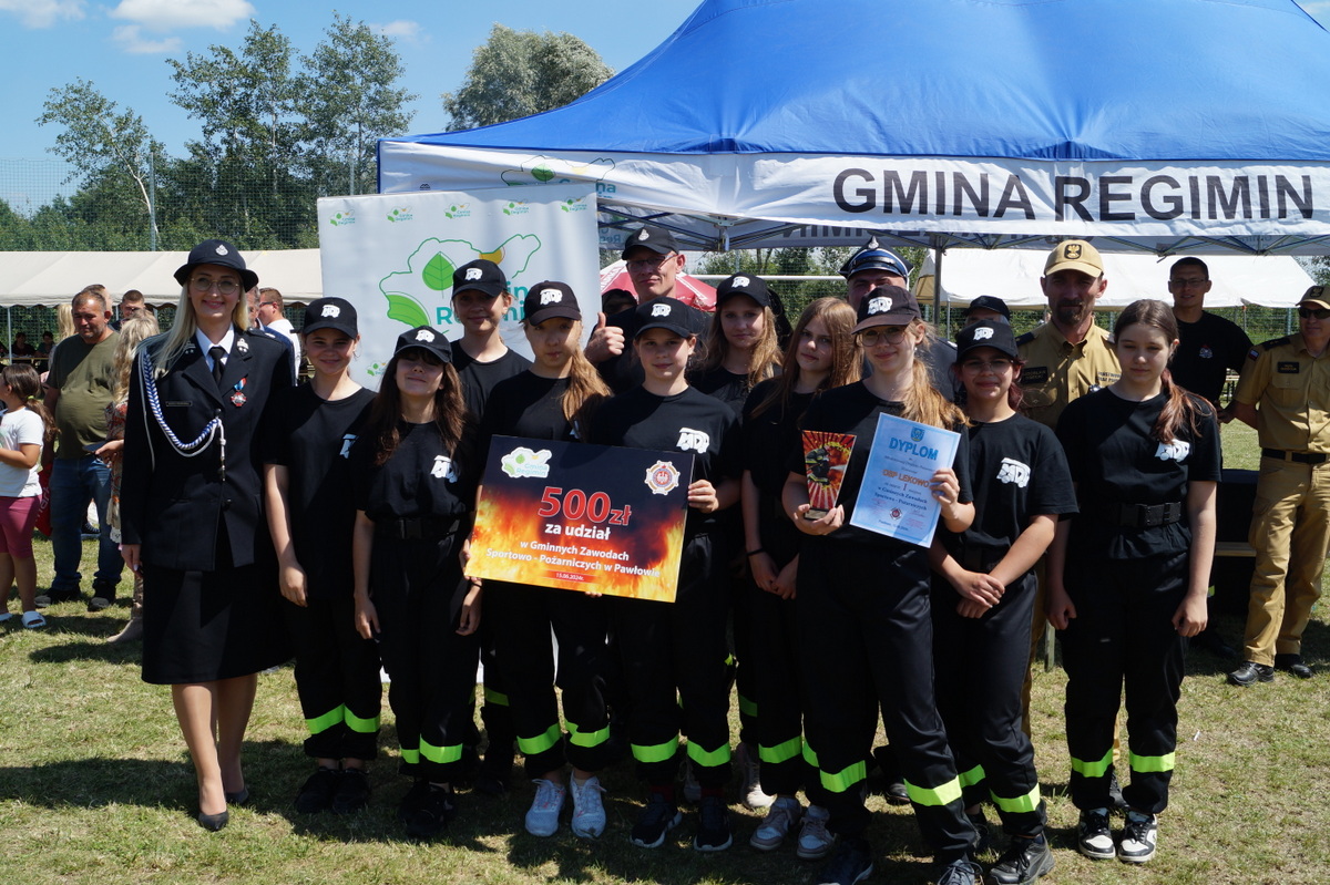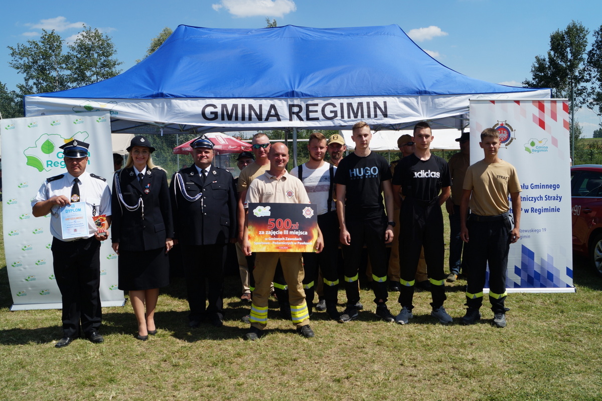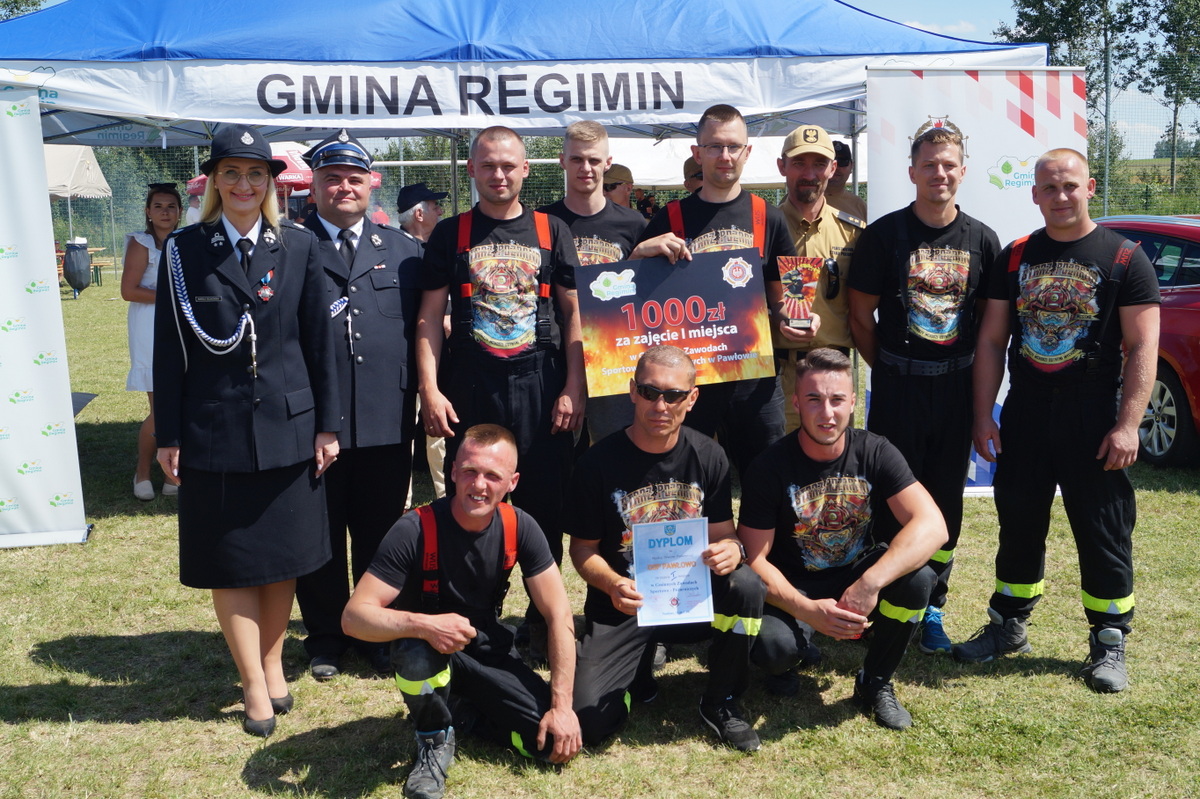 Puchary oraz nagrody wręczyli: Pani Mariola Kołakowska Wójt Gminy Regimin pełniąca jednocześnie funkcję Wiceprezesa ZOG ZOSP RP w Regiminie oraz dh Marcin Dobrzeniecki Naczelnik OSP Pawłowo. Pani Wójt podziękowała organizatorom, jednostce OSP w Pawłowie, za przygotowanie techniczne obiektu do przeprowadzenia zawodów.
