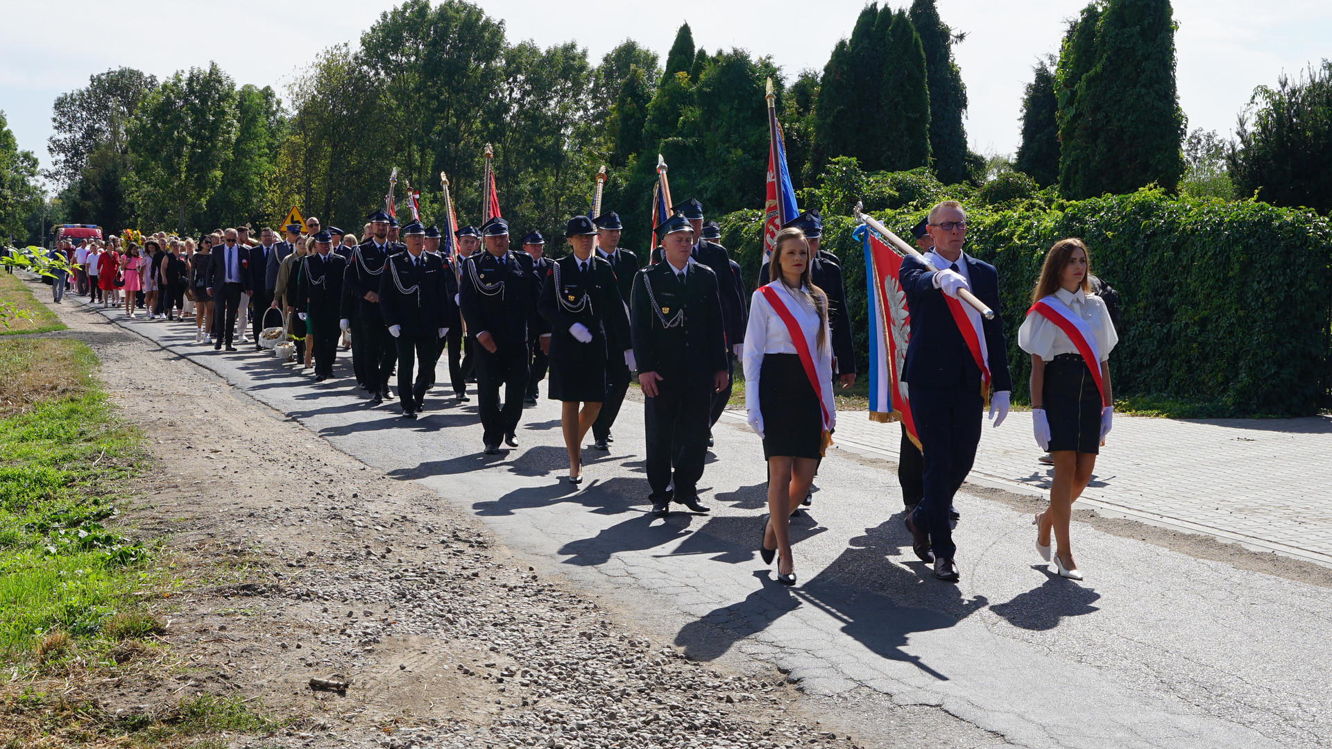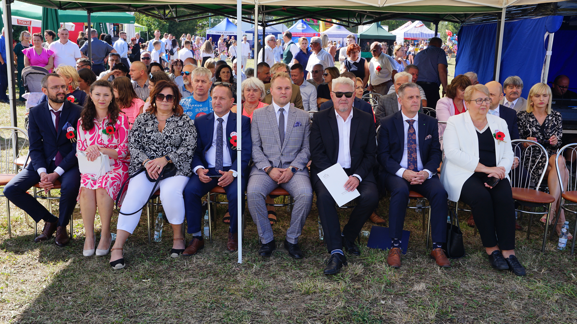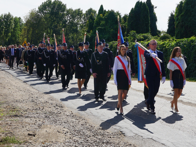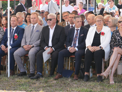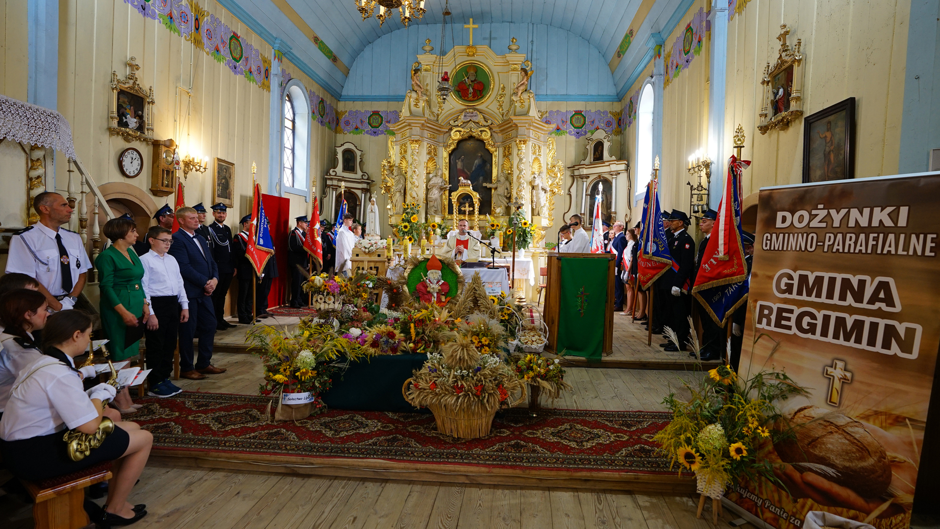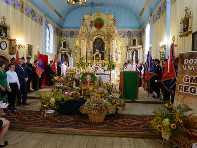 Uroczystość dożynkową uświetnił występ Orkiestry Dętej Ochotniczej Straży Pożarnej w Ciechanowie pod kierownictwem Pana Leopolda Sułkowskiego – Kornaus oraz obecność pocztów sztandarowych z terenu Gminy Regimin prowadzonych przez dowódcę uroczystości Druha Zbigniewa Bąkowskiego.