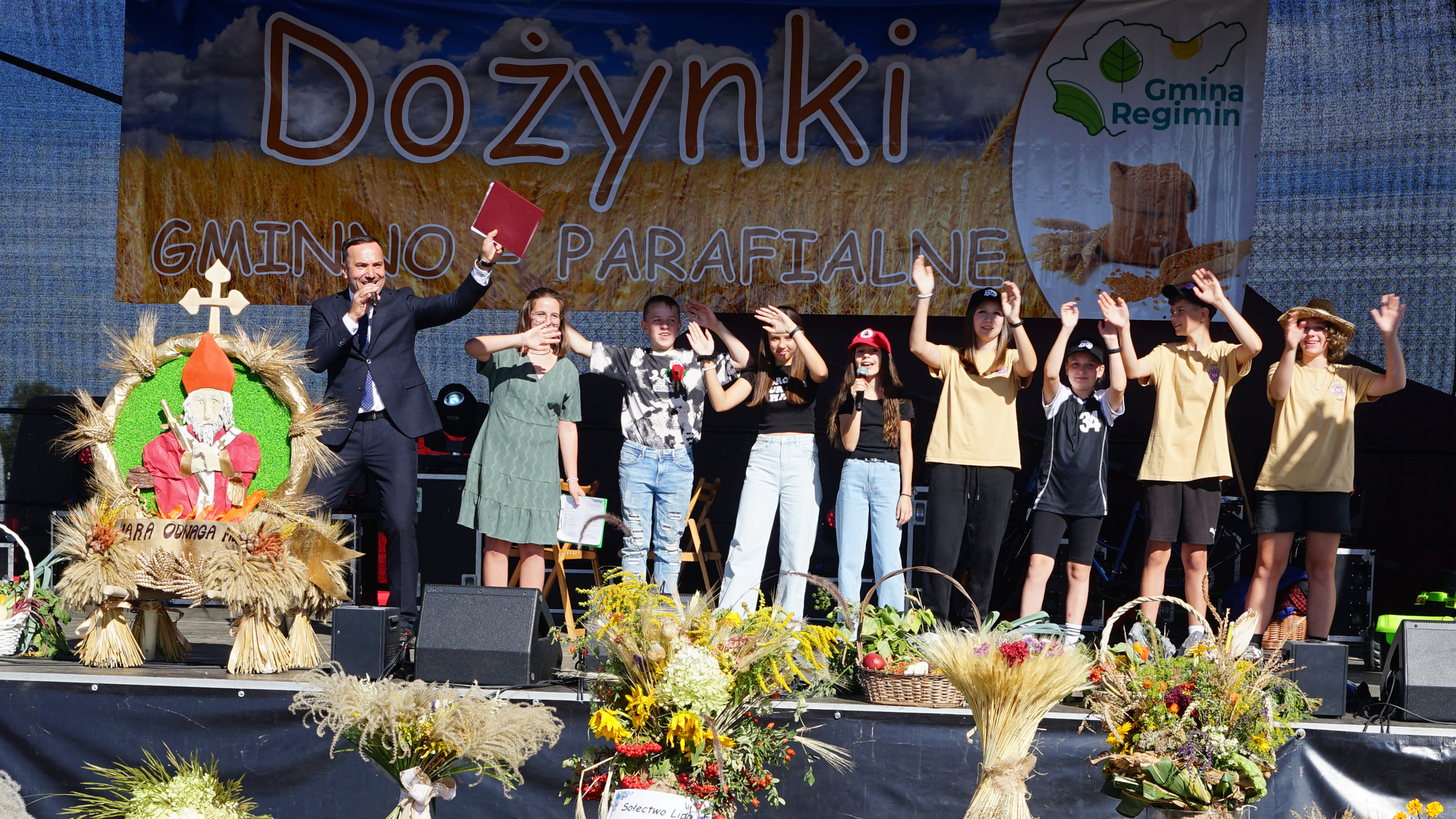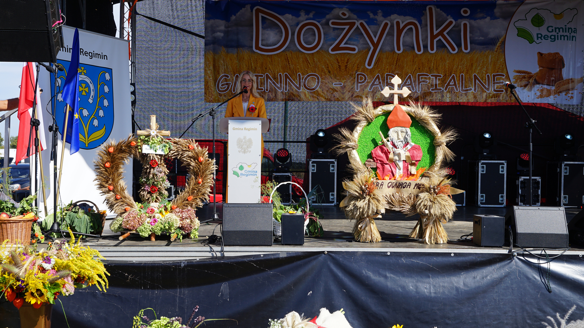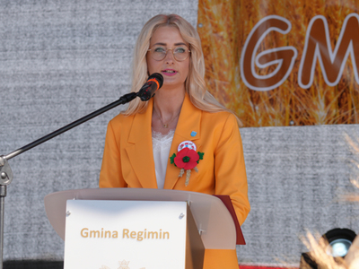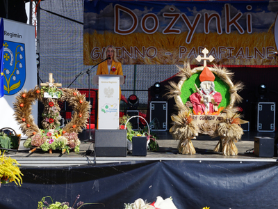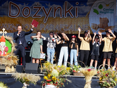 Wójt Gminy Regimin Pani Mariola Kołakowska przywitała serdecznie wszystkich gości i mieszkańców Gminy Regimin. Następnie rozpoczął się obrzęd dożynkowy, podczas którego Starostowie Dożynek Państwo Jolanta i Michał Więckiewicz przekazali Pani Wójt chleb dożynkowy, a następnie wspólnie z Panem Jackiem Olszewskim Przewodniczącym Rady Gminy Regimin oraz o. Łukaszem Nawotczyńskim udali się do mieszkańców, by wspólnie podzielić się chlebem.
