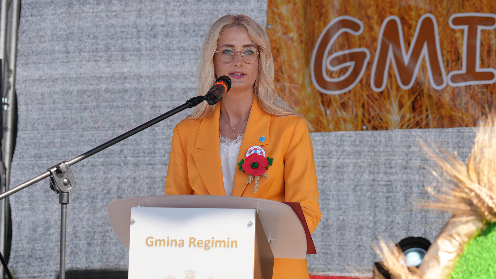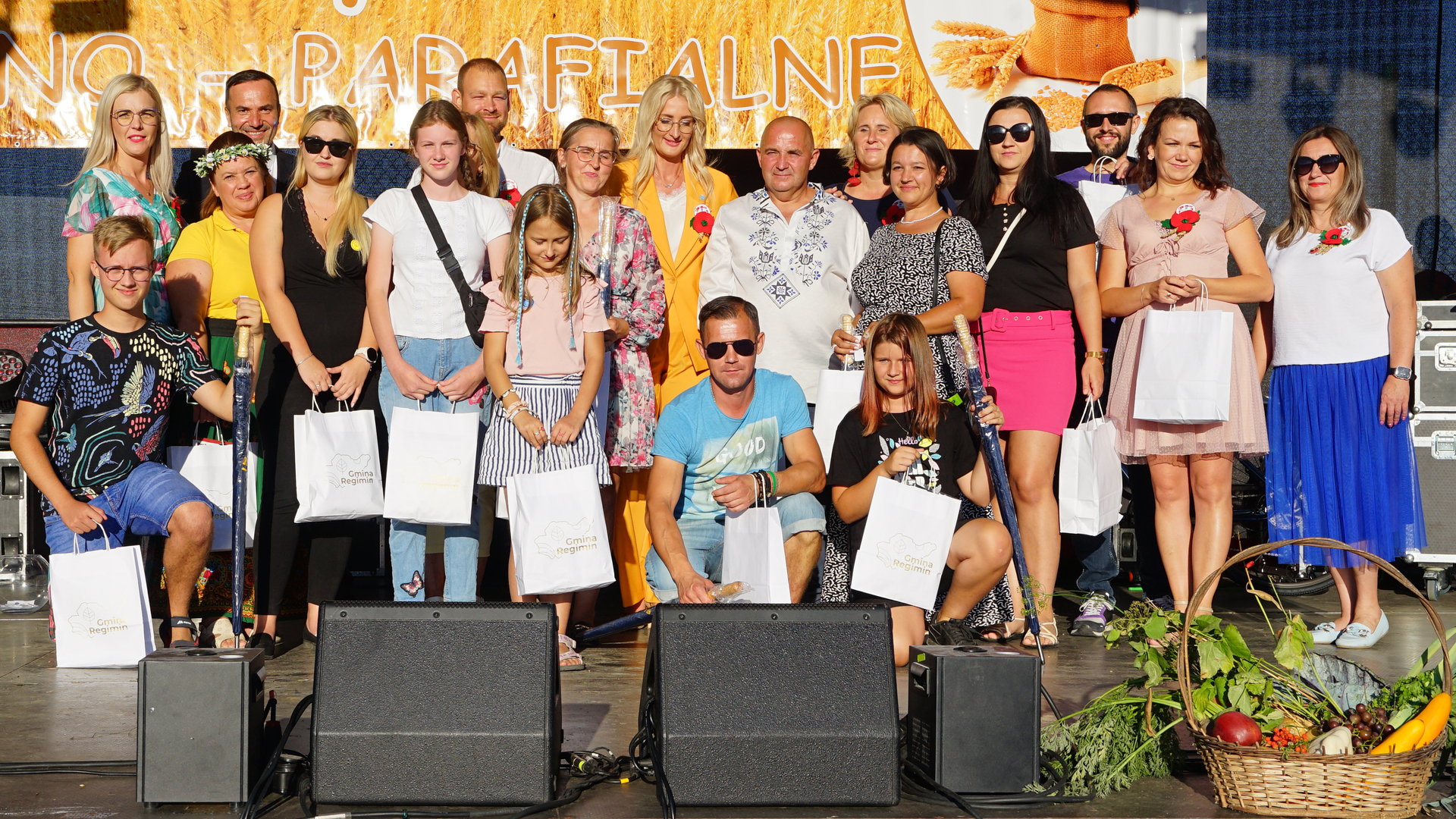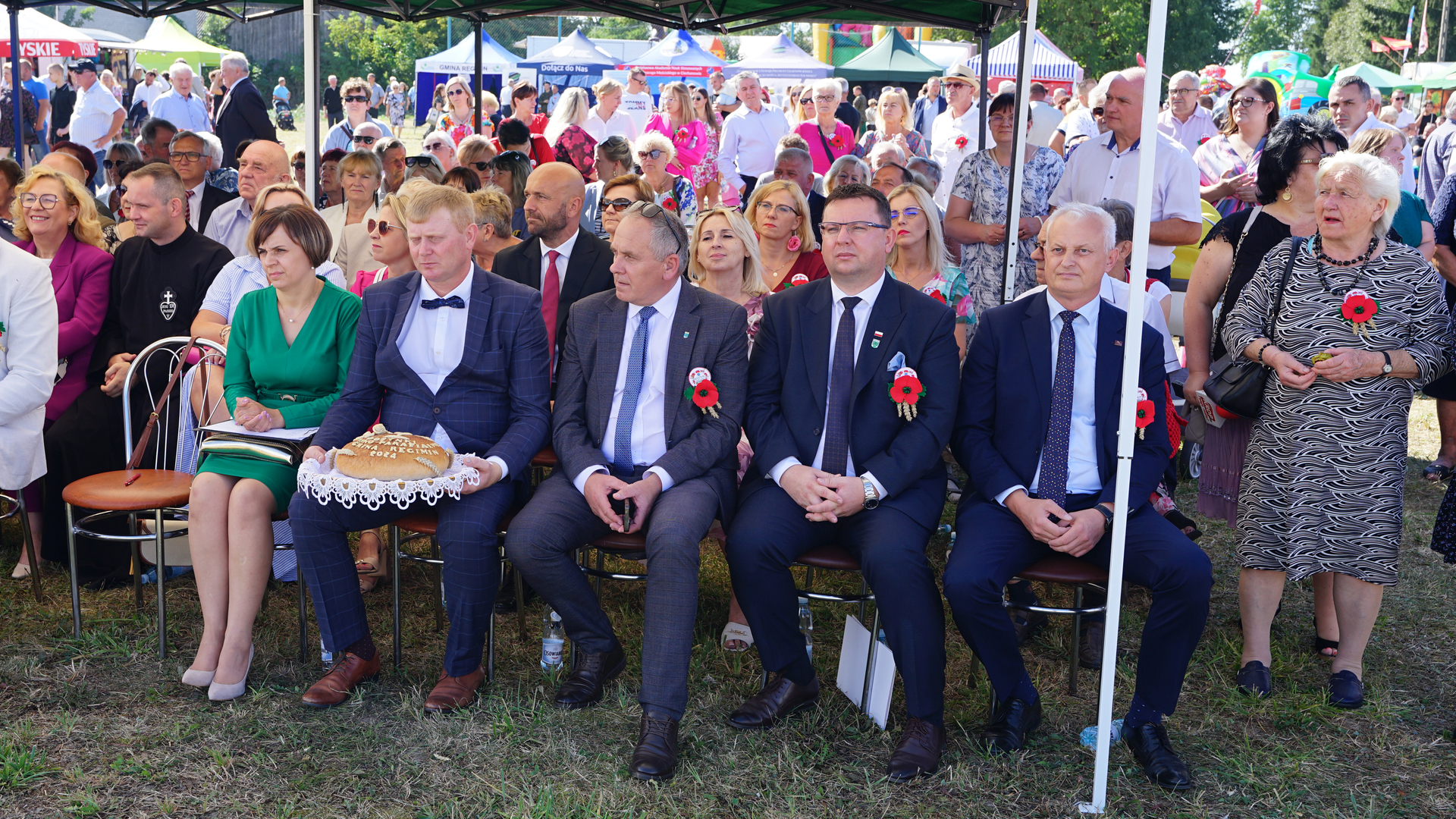 Wójt Gminy Regimin Pani Mariola Kołakowska przywitała serdecznie wszystkich gości i mieszkańców Gminy Regimin. Następnie rozpoczął się obrzęd dożynkowy, podczas którego Starostowie Dożynek Państwo Jolanta i Michał Więckiewicz przekazali Pani Wójt chleb dożynkowy, a następnie wspólnie z Panem Jackiem Olszewskim Przewodniczącym Rady Gminy Regimin oraz o. Łukaszem Nawotczyńskim udali się do mieszkańców, by wspólnie podzielić się chlebem.