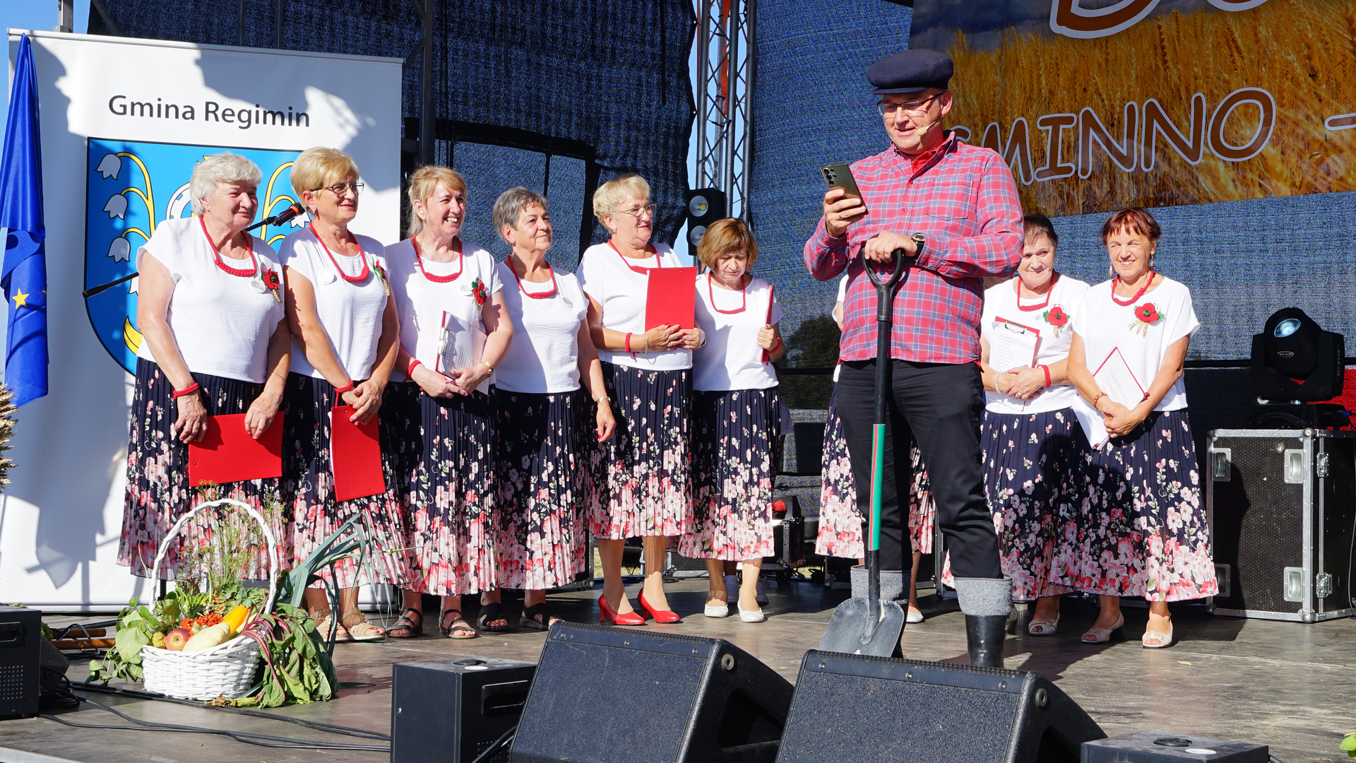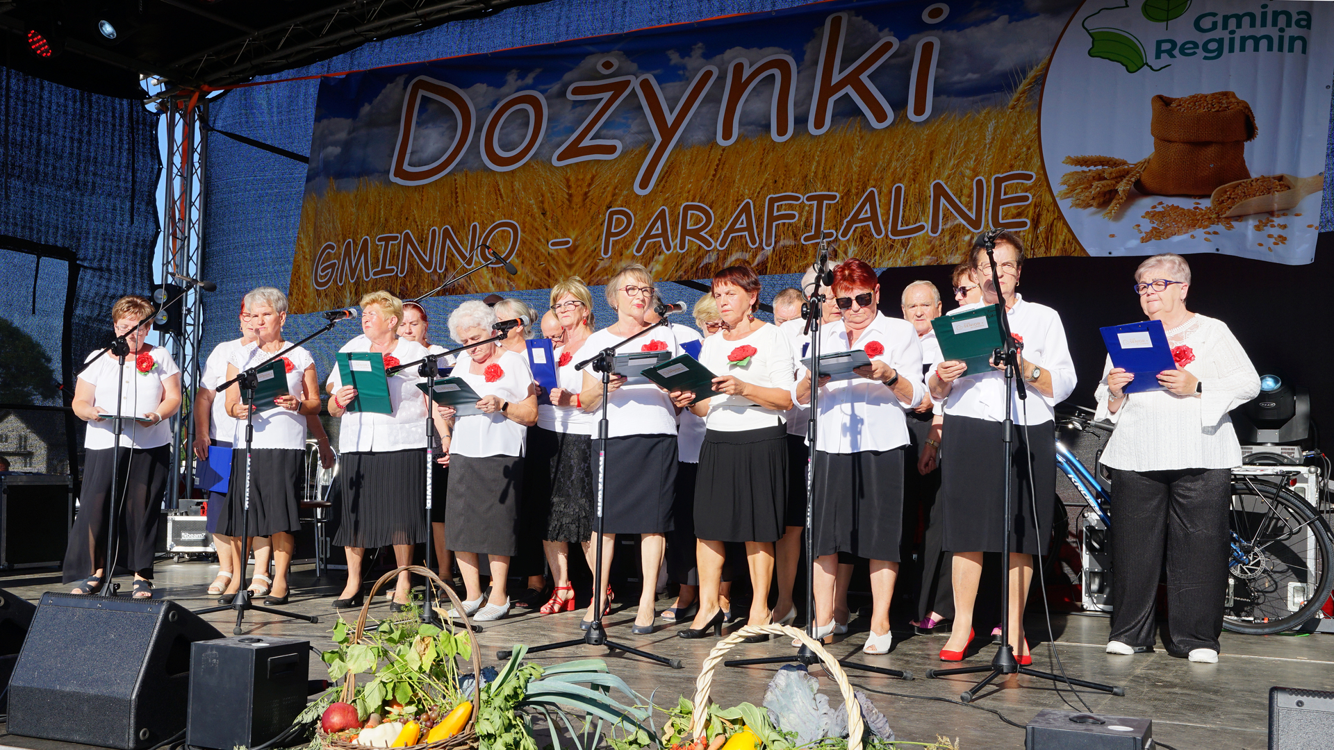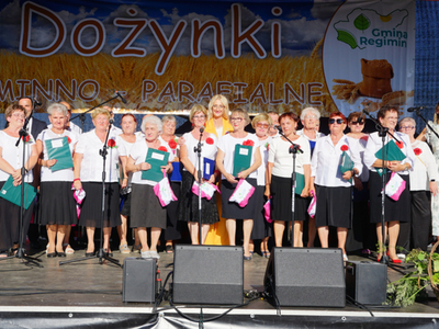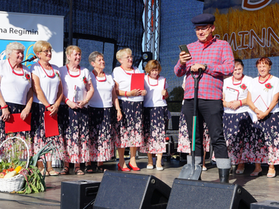 Na scenie mieliśmy również przyjemność obejrzeć występ przygotowany i przedstawiony przez Koło Gospodyń Wiejskich w Regiminie, które śpiewało pieśni ludowe, a także zaprezentowało skecz dożynkowy.